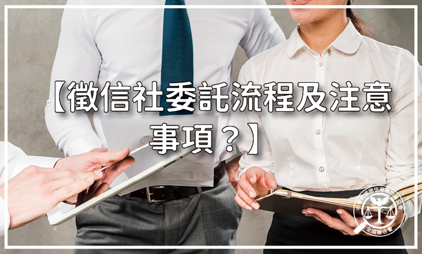 委託徵信社前,首先要了解該徵信社是否為正當立案公司,避免遇到假公司或個人公司,有捲款逃跑之危險,此外,「中華民國徵信商業同業公會全國聯合會」成員多具有專業徵信執照,若有辦案爭議,也有流程可以申訴,若您有調查需求,不妨從該會成員找起。委託流程通常如下: